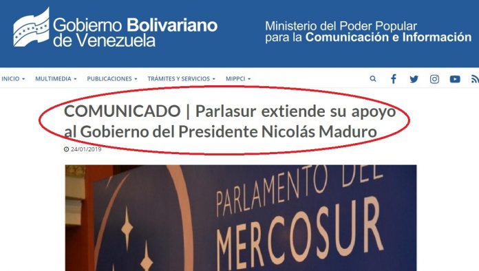 La página oficial de comunicaciones del régimen chavista, MINCI, vuelve a apelar a la mentira para hacer creer que recibe apoyo del Parlamento del Mercosur, Parlasur, y distorsiona la información con un título que nada tiene que ver con la realidad: “COMUNICADO | Parlasur extiende su apoyo al Gobierno del Presidente Nicolás Maduro”.