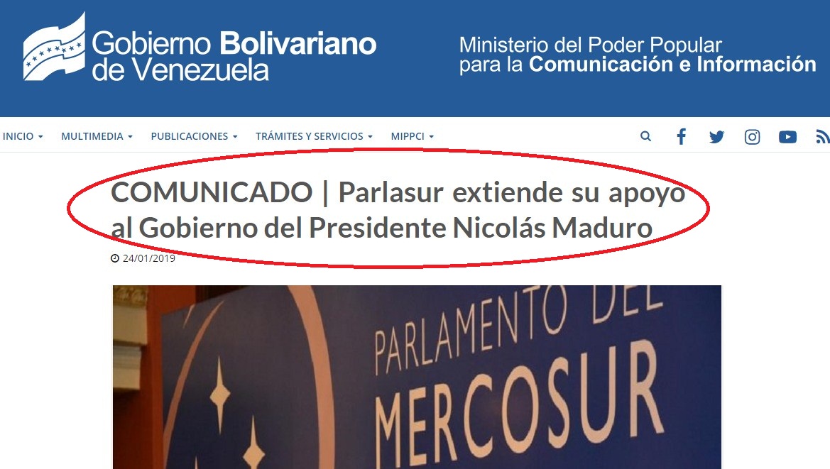 La realidad la reconoce el propio chavismo al explicar en el cuerpo de la nota que “Mediante un Comunicado Oficial, La Bancada Progresista del Parlamento del Mercado Común del Sur (Parlasur), rechazó categóricamente el intento de golpe de Estado contra el Presidente Constitucional de la República Bolivariana de Venezuela, Nicolás Maduro Moros, y respaldó la decisión del Ejecutivo Nacional de romper relaciones diplomáticas con el gobierno de Estados Unidos (EE.UU)”.