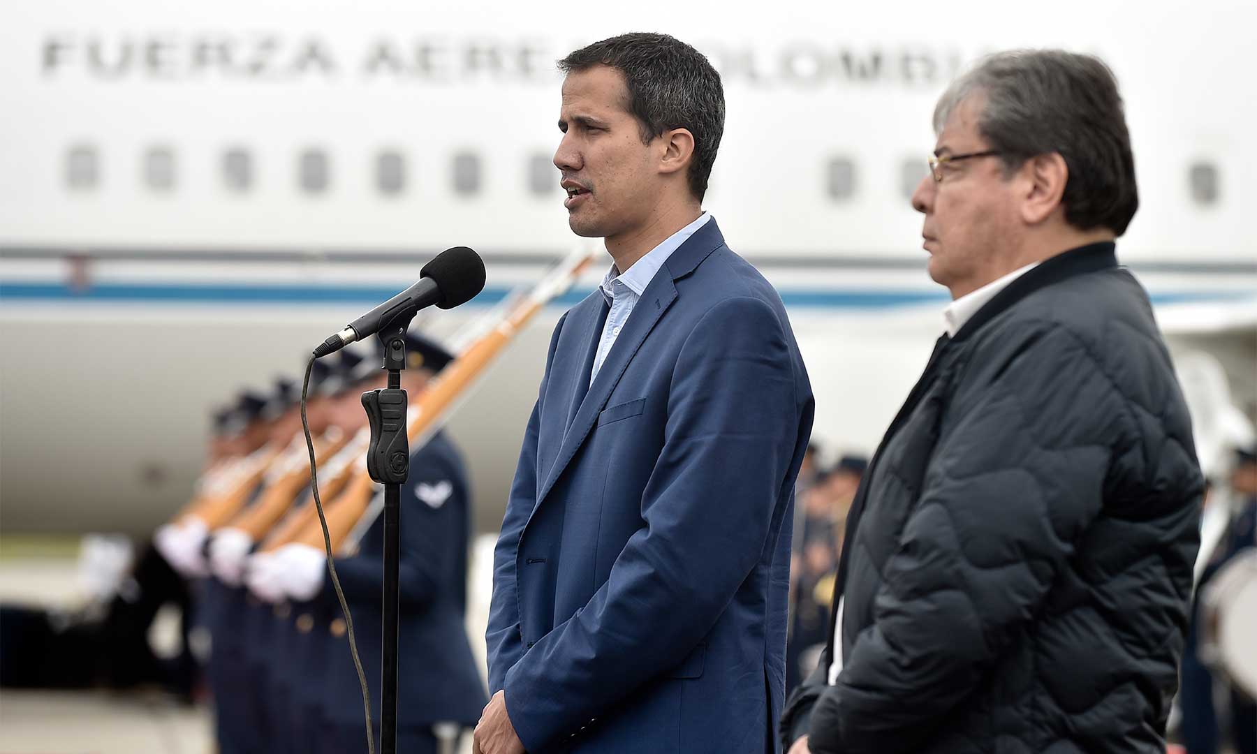 A su llegada este domingo a Bogotá, el Presidente interino de Venezuela, Juan Guaidó, dijo que haber impedido la entrada de ayuda humanitaria a su país es un “crimen sin precedentes” . A su lado el Canciller de Colombia.