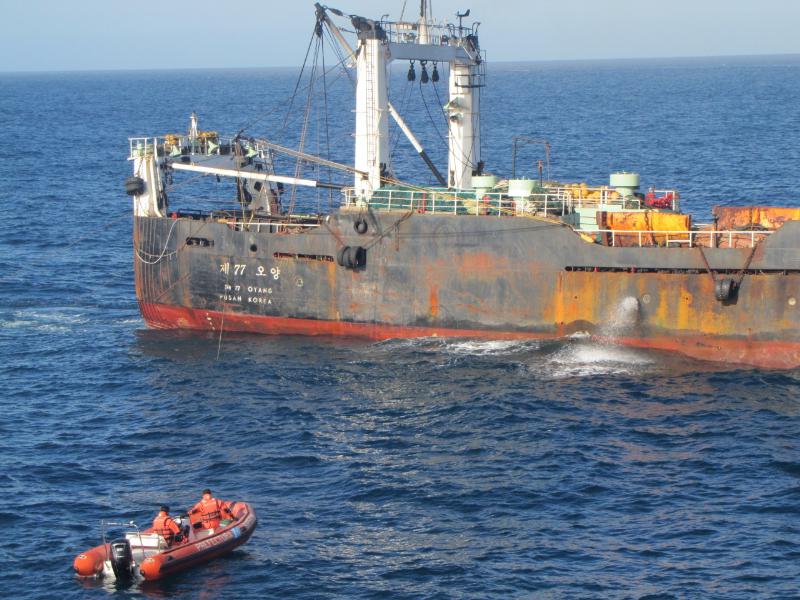 Buque surcoreano "Oyang 77"capturado por el guardacostas GC-24 "Mantilla" de la Prefectura, autoridad marítima de la Argentina. Foto: PNA.