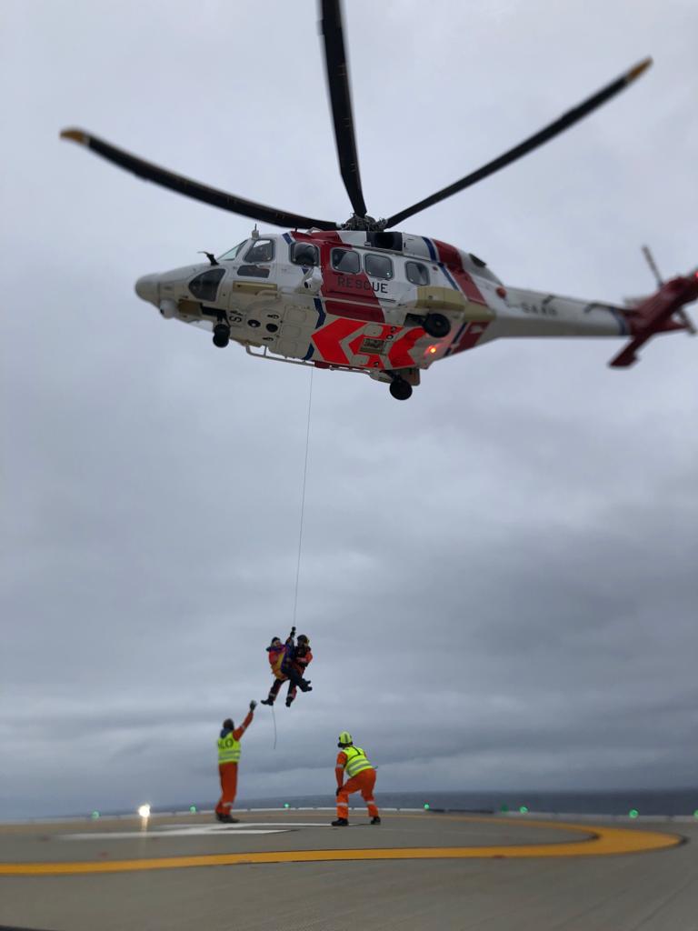 El buque Seabed Constructor bajó un bote de rescate, en condiciones de mar desafiantes logrando trasladar a la lesionada y abordo de dicho buque dar primeros auxilios en sus heridas en la cabeza.