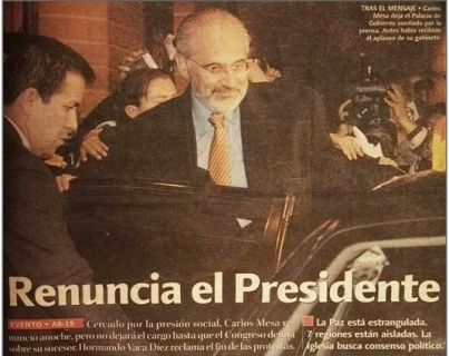 Mesa fue vicepresidente de Gonzalo Sánchez de Lozada (2002-2003) y asumió la jefatura del Estado tras la renuncia y la fuga del entonces presidente, después de los luctuosos sucesos de ‘octubre negro’, que dejaron el saldo de más de 60 muertos y cientos de heridos.