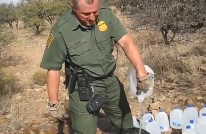 Un miembro de la guardia fronteriza de EEUU, tira el agua de los bidones que deja una ONG para que lo migrantes no mueran de sed en el desierto de Arizona (Imagen del video de @NoMoreDeaths)