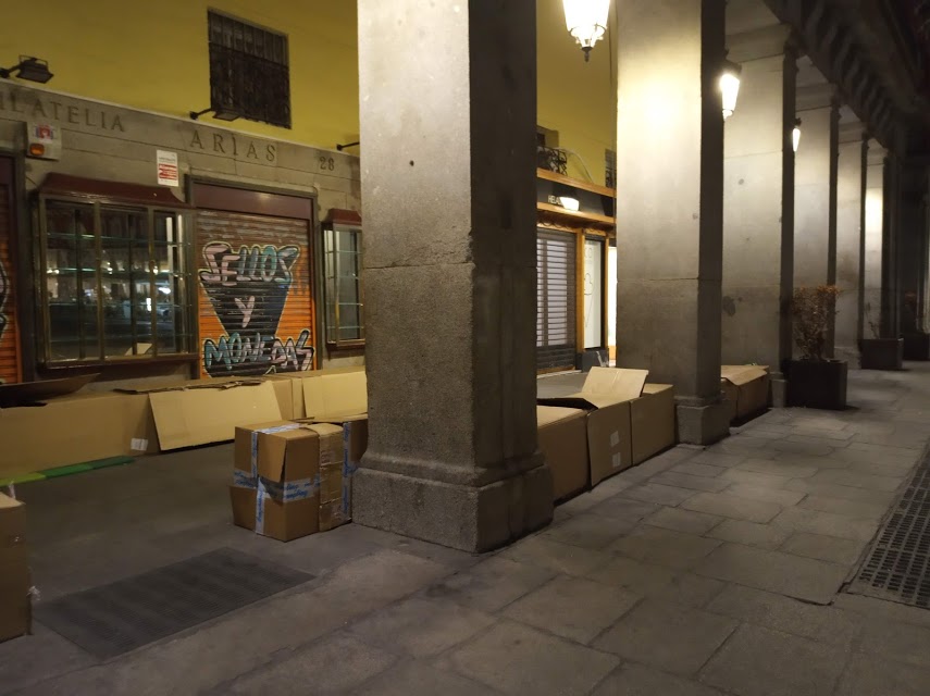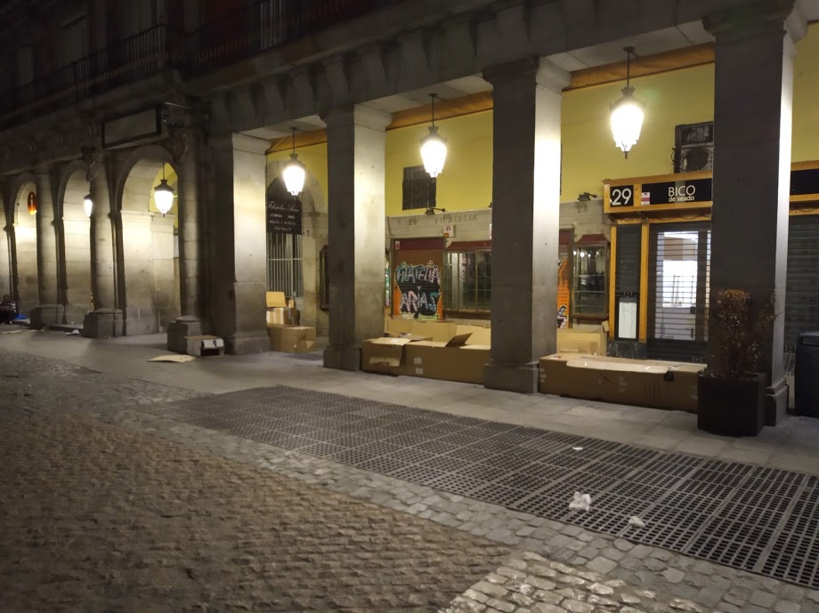 Durante el día, todo el esplendor de la famosa Plaza Mayor, ubicada a escasos metros de la no menos reconocida Puerta del Sol de la capital madrileña, recorrida por cientos de turistas en una ola de un calor que a pesar del otoño se niega a irse, pero durante la noche el panorama cambia, no en seguridad, pero si en las personas que montan sus precarios “dormitorios”, conformados por cartones prolijamente armados para pasar la noche.