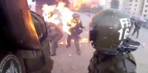 Dos Carabineras de la 28a. Comisaría  de las  Fuerzas Especiales de Chile fueron atacadas con bombas molotov por mientras ejercían labores de vigilancia y control en una nueva jornada de protestas en Santiago de Chile.