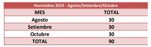 En agosto ocurrieron 30 homicidios, en setiembre 30 homicidios más y en octubre otros 30 homicidios.                                                                                                  Prácticamente, no hay un día en el mes en que no haya una familia llorando a una víctima asesinada.