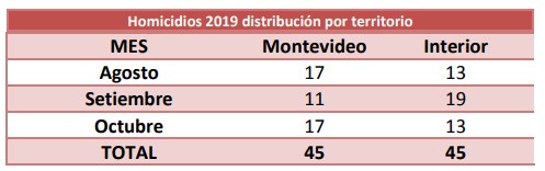 En los datos del cuadro siguiente también se puede ver la distribución de los homicidios entre la capital y el resto del país. Y como se observa, Montevideo en esos 3 meses registró un total de 45 homicidios, mientras que en el interior del país ocurrieron otros 45.