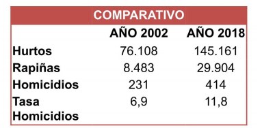 Otro dato que ilustra el deterioro que se enfrenta en materia de seguridad, es comparar la situación en materia de delitos al cierre del año 2002 luego de la crisis económica más importante de la historia del país, con los datos al cierre del año 2018, luego de más de una década de crecimiento y bonanza económica.