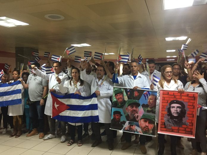 Los profesionales cubanos comenzaron a llegar al aeropuerto de la isla y se les hizo entrega de pequeñas banderas de Cuba y carteles con Fidel Castro y el Che Guevara, para mostrarlos en las fotografías oficiales.