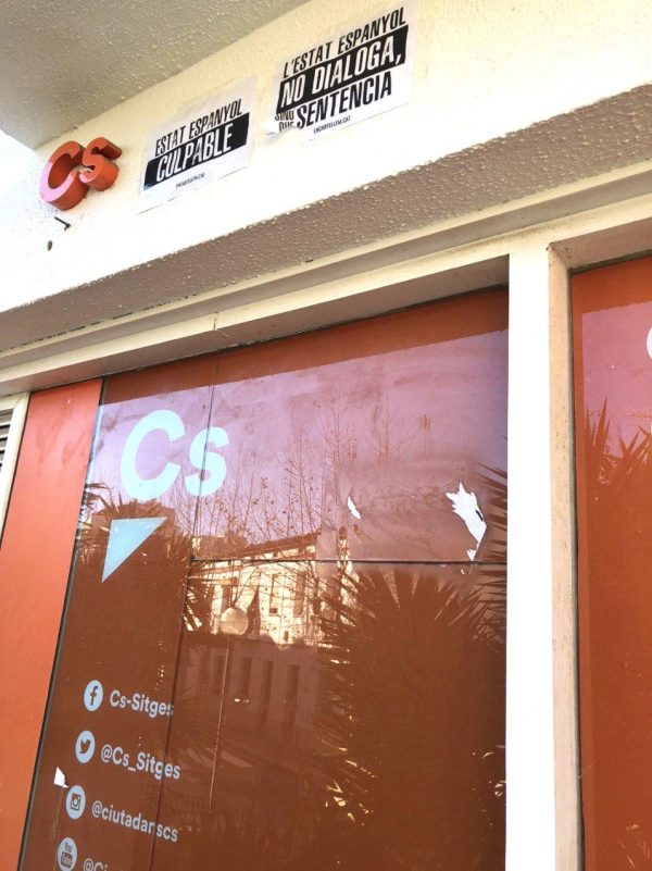 Un grupo de desconocidos atacaron este domingo la sede del partido Ciudadanos- Cs en Sitges localidad ubicada a unos 45 minutos de Barcelona, rompiendo los cristales exteriores del inmueble, al tiempo de dejar panfletos con consignas a favor del independentismo.