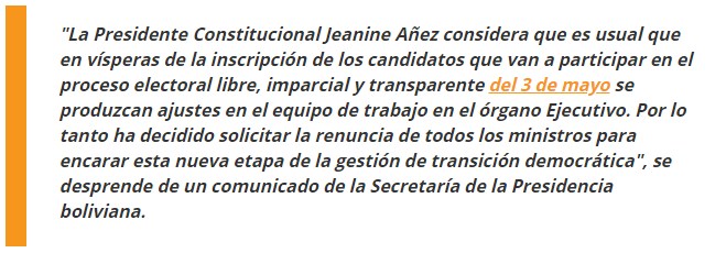 El anuncio se produce horas después de que la ministra de Comunicación, Roxana Lizárraga, presentara su renuncia en una carta en la que afirmó que el “gobierno transitorio ha perdido sus objetivos” y criticó la decisión de Áñez para ser candidata para las elecciones de próximo mayo.