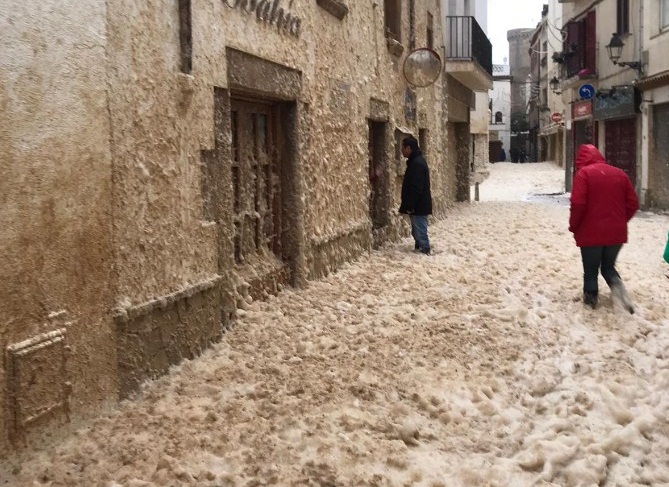 Por el temporal, la espuma del mar invadió las calles de Tossa de Mar municipio español perteneciente a la provincia de Gerona, Cataluña.