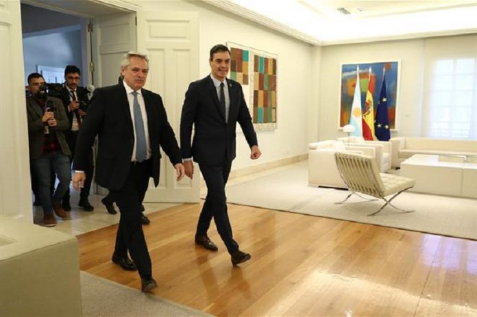 El presidente del Gobierno español, Pedro Sánchez, ha recibido este martes en el Complejo de La Moncloa al kirchnerista presidente de Argentina, Alberto Fernández en su primer encuentro bilateral tras la reciente formación de Gobierno en ambos países. Pedro Sánchez y Alberto Fernández, según un comunicado de La Moncloa, han acordado dar un importante impulso a las relaciones bilaterales, ahora de la mano de “dos gobiernos progresistas”.