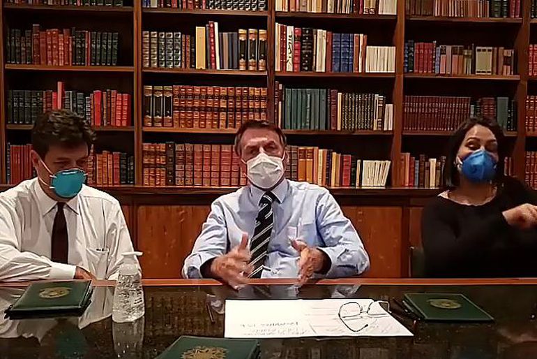 En la transmisión en vivo en las redes sociales todos los jueves, Jair Bolsonaro estuvo acompañado por el Ministro de Salud, Luiz Henrique Mandetta. Ambos y el intérprete de Libra llevaban máscaras. El presidente explicó el motivo de la protección.