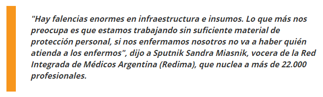 Sputnik.- Primera línea en la batalla contra el coronavirus, los profesionales sanitarios denuncian condiciones precarias para enfrentar la pandemia en Argentina. Como en otros países, no cuentan con protección suficiente ni recursos de parte de las instituciones, empleadores y aseguradoras ante la alta probabilidad de contagio de la enfermedad COVID-19.
