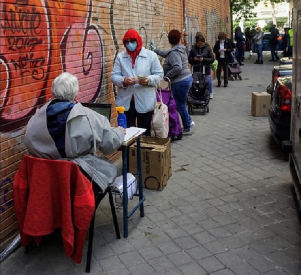 Hoy, barrios con gente de escasos recursos en Madrid viven una situación alarmante de pobreza. Una larga cola de personas se ha vuelto a ver este sábado en el barrio madrileño de Aluche para recoger una bolsa con comida y poder mantener a sus familias una semana más.