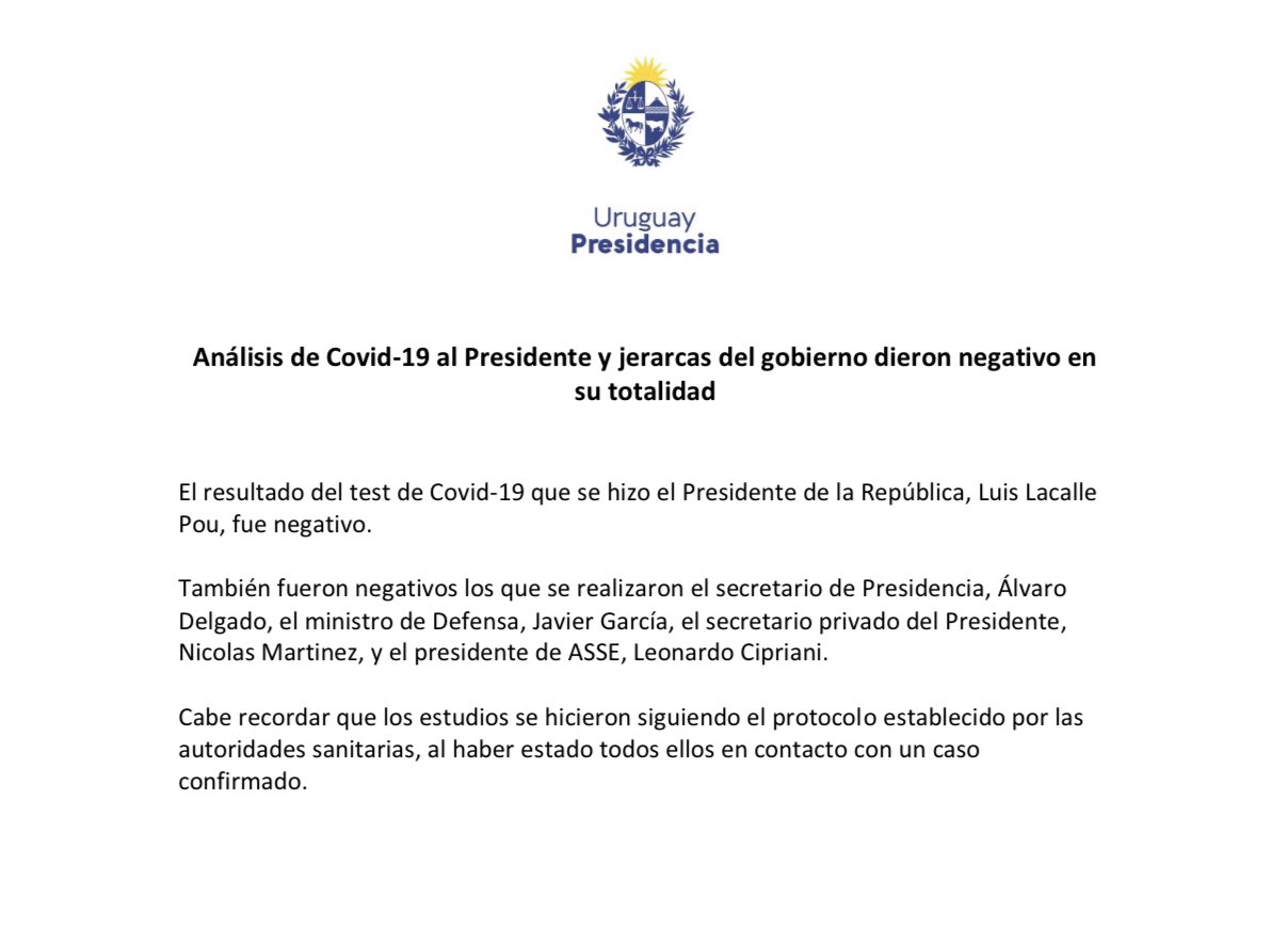 El presidente de Uruguay, Luis Lacalle Pou, dio nagativo al test de coronavirus como también el ministro de Defensa Nacional, Javier García; el secretario de Presidencia, Álvaro Delgado; y el presidente de ASSE, Leonardo Cipriani