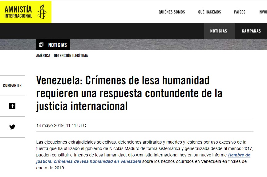O el informe de Amnistía Internacional de 2019: Las ejecuciones extrajudiciales selectivas, detenciones arbitrarias y muertes y lesiones por uso excesivo de la fuerza que ha utilizado el gobierno de Nicolás Maduro de forma sistemática y generalizada desde al menos 2017, pueden constituir crímenes de lesa humanidad, dijo Amnistía Internacional hoy en su nuevo informe Hambre de justicia: crímenes de lesa humanidad en Venezuela sobre los hechos ocurridos en Venezuela en finales de enero de 2019.