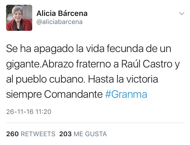 “Se ha apagado la vida fecunda de un gigante. Abrazo fraterno a Raúl Castro y al pueblo cubano. Hasta la victoria siempre comandante #Granma”, fue el tuit de la señora Bárcena que luego debió borrar ante la avalancha de críticas.