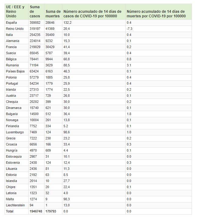 En su informe, el Centro Europeo para la Prevención y Control de Enfermedades (ECDC) señala: A 18 de agosto de 2020, se habían notificado 179793 muertes en la UE / EEE y el Reino Unido: Reino Unido (41369), Italia (35400), Francia (30429), España (28646), Bélgica (9944 ), Alemania (9 232), Países Bajos (6 163), Suecia (5 787), Rumanía (3 029), Polonia (1 885), Portugal (1 779), Irlanda (1 774), Austria (729), Dinamarca (621), Hungría (609), Bulgaria (512), Chequia (399), Finlandia (334), Noruega (261), Grecia (230), Croacia (166), Luxemburgo (124), Eslovenia (124), Lituania (81), Estonia (63), Letonia (32), Eslovaquia (31), Chipre (20), Islandia (10), Malta (9) y Liechtenstein (1).
