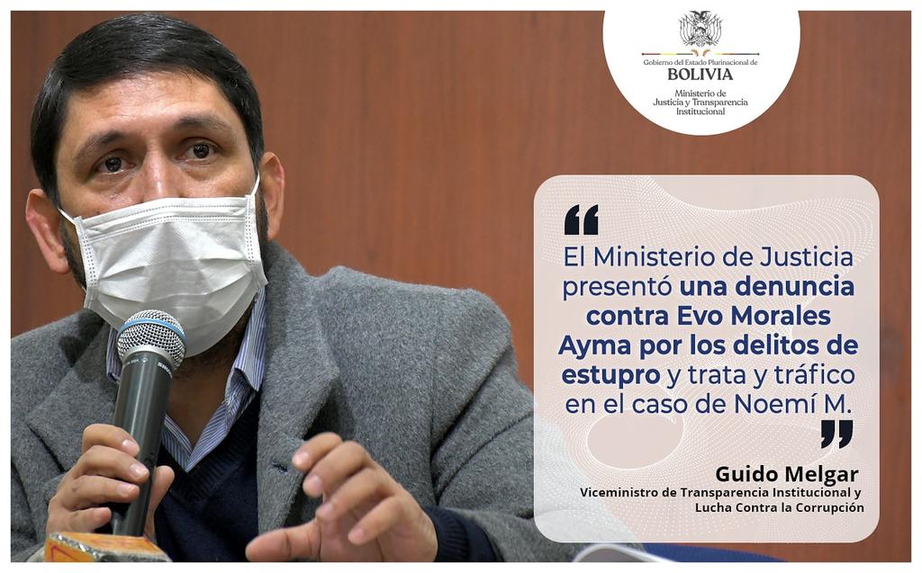Ayer, el Ministerio de Justicia presentó una denuncia en contra de Morales por la probable comisión de los delitos de estupro y trata y tráfico de personas, a partir de las pruebas obtenidas del vaciado de los datos de celulares de un grupo de personas (entre ellas la supuesta pareja de Morales) que fueron aprehendidas en un surtidor, cuando estaban a bordo de un vehículo reportado como robado y que pertenecía a la Gobernación de Cochabamba.