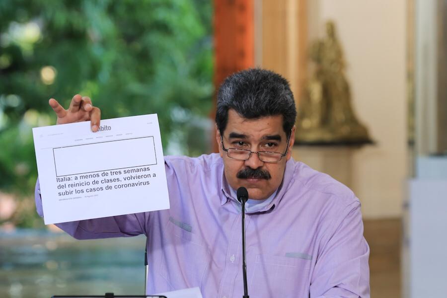 Ante el alto índice de contagios, Maduro señaló: “Tomando en consideración las consultas realizadas y las experiencias en el mundo, concluimos que el retorno a clases presencial no es favorable para el control de la Pandemia. Por ello pedí al ministro @psuvaristobulo presentar la formula para el inicio de las clases online”.
