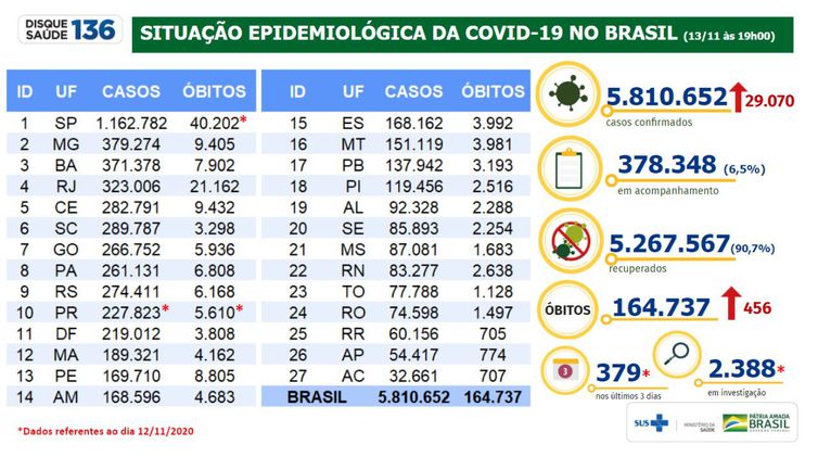 El saldo fue publicado por el Ministerio de Salud el viernes por la noche (13). Hoy la cartera también hizo un comunicado explicando que las dificultades en la actualización esta semana se debieron a un problema en los sistemas informáticos que podría ser un ciberataque .