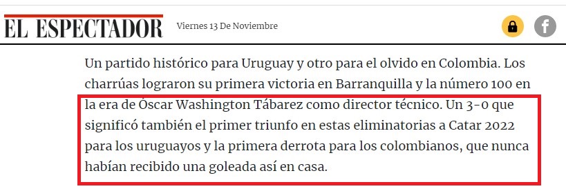 Los colombianos quedaron tan desconcertados por la derrota de su seleccionado nacional ante Uruguay por las eliminatorias para Catar 2022 que en la gran confusión el diario de Colombia, El Espectador, dice en un artículo: “Un partido histórico para Uruguay y otro para el olvido en Colombia. Los charrúas lograron su primera victoria en Barranquilla y la número 100 en la era de Óscar Washington Tábarez como director técnico. Un 3-0 que significó también el primer triunfo en estas eliminatorias a Catar 2022 para los uruguayos y la primera derrota para los colombianos, que nunca habían recibido una goleada así en casa”.