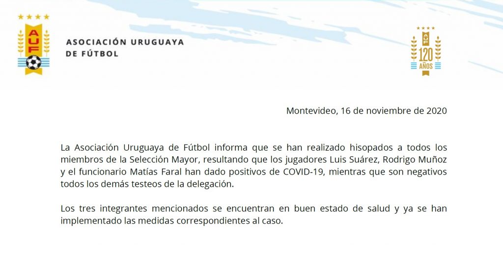 El comunicado de la AUF informa que dos futbolistas y un funcionario administrativo dieron positivo al coronavirus. Entre los jugadores con Covid-19 están Luis Suárez y el portero Rodrigo Muñoz, mientras el jefe de prensa de la selección uruguaya, Matías Faral, dio positivo.