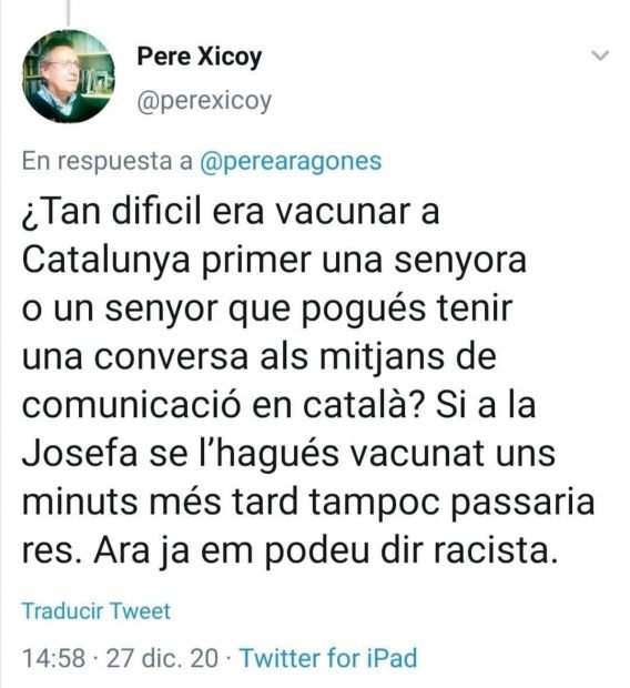 Según informa OKDIARIO, otro separatista escribió un tuit que luego borró: «¿Tan difícil era vacunar en Cataluña primero a una señora o un señor que pudiera tener una conversación con los medios de comunicación en catalán? Si a Josefa se la hubiera vacunado unos minutos más tarde tampoco pasaría nada. Ahora ya me podéis llamar racista», señaló, pero terminó borrando el mensaje.