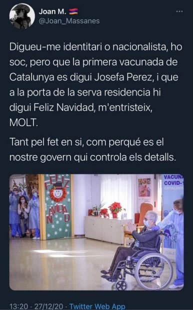 Otro de los “indignados” independentistas escribió: «Llamadme identitario o nacionalista, lo soy, pero que la primera vacunada de Cataluña se llame Josefa Pérez, y que en la puerta de la residencia diga Feliz Navidad, me entristece, MUCHO. Tanto del hecho en sí, como porque es nuestro gobierno quien controla los detalles», aseveró.