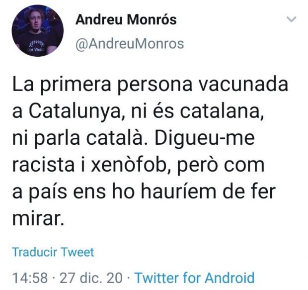 Un separatista puso en Twitter: «La primera persona vacunada en Cataluña, ni es catalana, ni habla catalán. Llamadme racista y xenófobo, pero como país deberíamos hacérnoslo mirar».