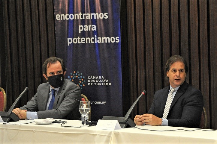 El presidente Luis Lacalle Pou estuvo presente en la exposición de la estrategia promocional de turismo interno frente al Covid-19 que organizó la Cámara Uruguaya de Turismo este lunes 30. Entre otras medidas, el Gobierno dispuso tasa cero de IVA en hotelería, descuento de 9 puntos de IVA para la actividad gastronómica y alquileres de autos, y beneficios en los aportes patronales de los contratos nuevos o para la reincorporación de empleados.