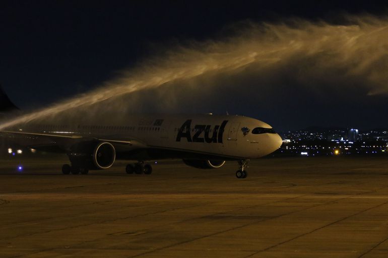 El avión fue recibido en la pista con un bautismo simbólico, con chorros de agua lanzados en forma de arco por los bomberos del aeropuerto de Rio-Galeão.
