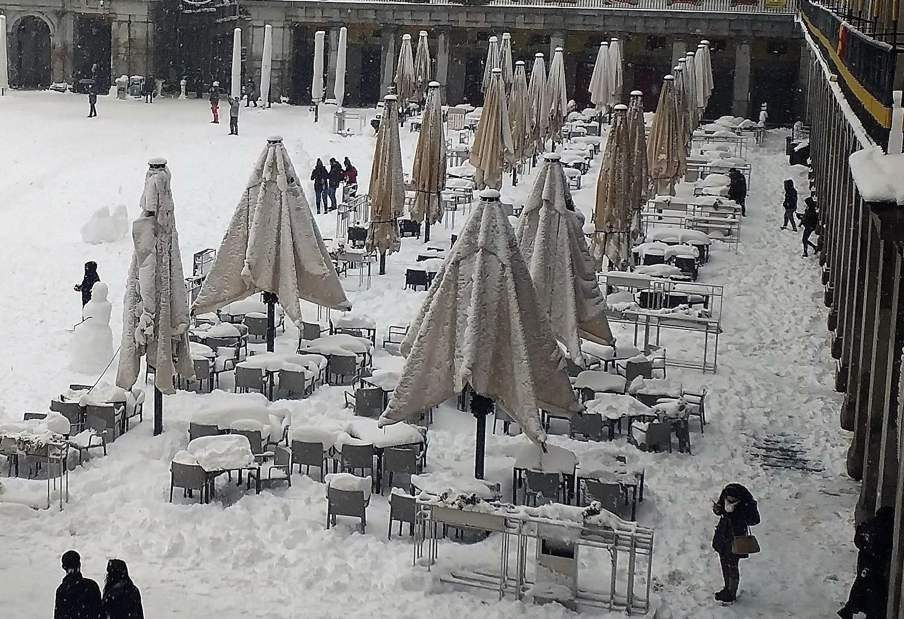 Las terrazas de los restaurantes de la Plaza Mayor sepultadas bajo la nieve generando perdidas en el sector. (Foto: ICNDiario)