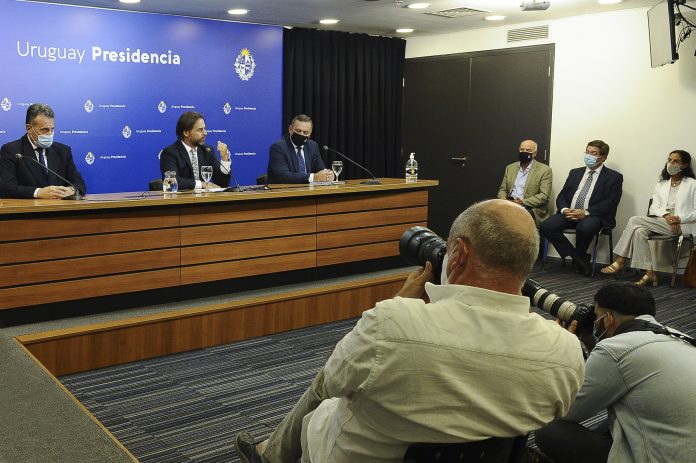 Tras la reunión de los ministros con el presidente, Lacalle Pou brindó una conferencia de prensa, acompañado por el secretario de la Presidencia, Álvaro Delgado, y el ministro de Salud Pública, Daniel Salinas.