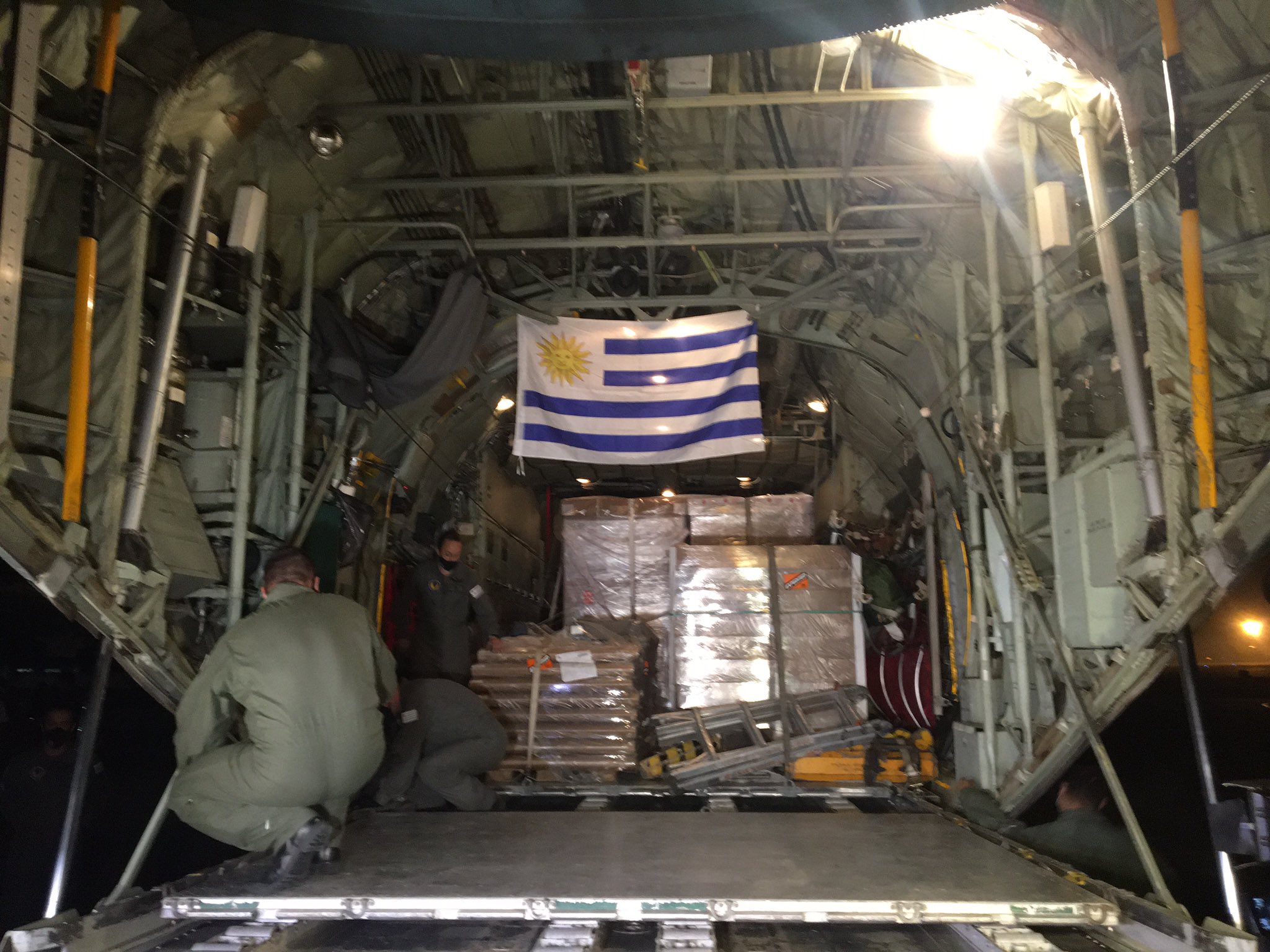 El ministro de Defensa Nacional de Uruguay, Javier García, el presidente del Sistema Nacional de Emergencia (Sinae), Cnel. (r) Sergio Rico y el comandante de la Fuerza Aérea, Gral. del aire Luis de León, concurrieron a la base de la Fuerza Aérea, para recibir el avión y saludar a la tripulación que realizó la misión.