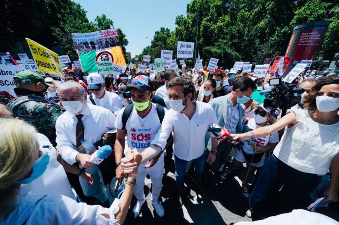 Durante el recorrido de cerca de un kilómetro, desde la plaza de Cibeles hasta la plaza de Callao, en la capital española, también acompañó el líder del Partido Popular español, Pablo Casado Blanco, quien describió al gobierno cubano en su cuenta de Twitter como “una dictadura”.