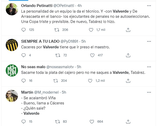 Ana Inés Martínez, es sin lugar a dudas una de las periodistas deportivas más creíbles del medio uruguayo y dijo algo que la mayoría de los aficionados piensa sobre Tabárez: “Ya saben lo que opino. Uruguay quedó eliminado de la Copa América tras caer por penales con Colombia. Pongan ya “La Peluquería de Don Mateo” que venimos con todas las repercusiones del partido por @canal10uruguay. Sigo sin entender muchas cosas … por ejemplo guardarse 3 cambios!”.