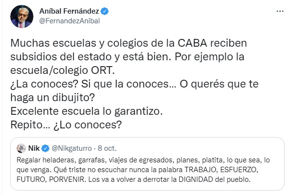 El ministro reaccionó diciendo que muchos colegios reciben subsidios del gobierno y como ejemplo citó el instituto donde estudian las hijas de Nik. “Muchas escuelas y colegios de la CABA reciben subsidios del estado y está bien. Por ejemplo la escuela/colegio ORT. ¿La conoces? Si que la conoces… O querés que te haga un dibujito? Excelente escuela lo garantizo. Repito… ¿Lo conoces?”, escribió el ministro, dejando en claro que conoce el colegio donde estudian las hijas del dibujante.