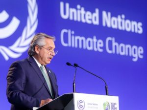 “La crisis sanitaria de la pandemia COVID 19 no hizo sino desnudar una crisis mucho mayor y multidimensional de insostenibilidad y desequilibrio que afecta al ambiente, la sociedad y la economía” y que “amplió las brechas preexistentes, entre países y personas”, afirmó el mandatario argentino en el inicio de su intervención, en el Scottish Event Campus, donde estuvo acompañado por el canciller Santiago Cafiero.