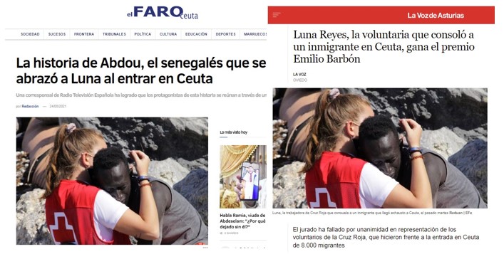 La voluntaria de la Cruz Roja, Luna Reyes, que ha quedado registrada en una fotografía abrazando a un inmigrante senegalés sentado sobre una roca tras llegar exhausto a la costa de Ceuta, ha sido galardonada con el premio de la XVIII edición de la Fundación Emilio Barbón.