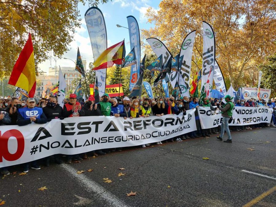 Miles de policías se han concentrado este sábado en el centro de Madrid con el objetivo de protestar en contra de la reforma de la ley de Seguridad Ciudadana que impulsa el gobierno de Pedro Sánchez. Los agentes aseguran que la reforma vulnera y desprotege a sus miembros frente a hipotéticas agresiones o difusiones de su imagen que, denuncian, puede llegar a afectar a sus familias, además de limitar su actividad frente a violentos y radicales.