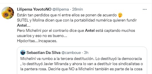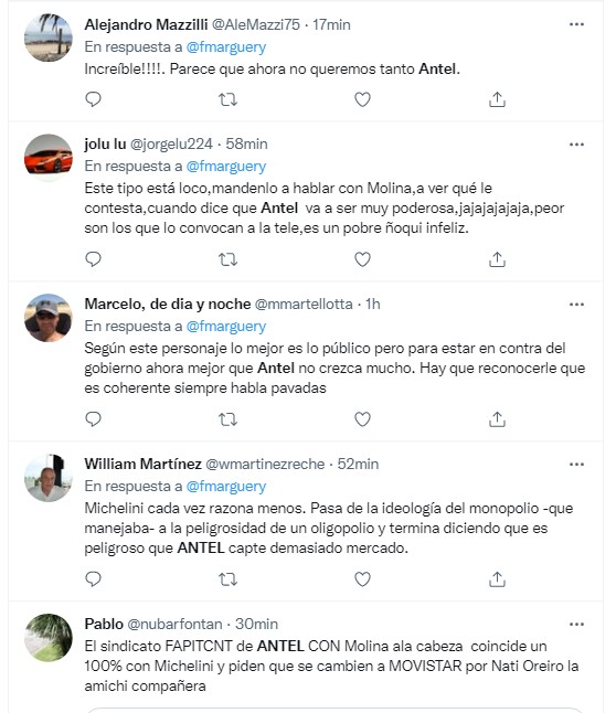 El panelista de esta “Boca es mía”, Fernando Marguery, no daba crédito a lo que estaba escuchando de boca del propio Michelini y respondió en las redes al cambio de opinión del ex legislador: “De criticar la portabilidad numérica porque iba a desmantelar Antel, a criticar la portabilidad porque va volver muy potente a Antel, y todo en unos pocos minutos”.