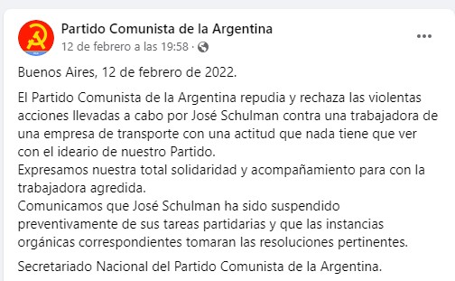 Argentina: Partido Comunista suspende al dirigente que golpeó en forma cobarde a una trabajadora