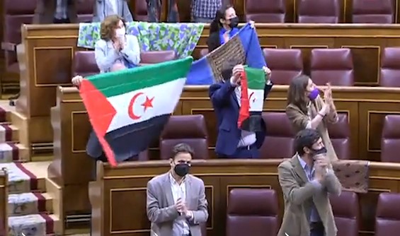 Este martes, los diputados del izquierdista partido Unidas Podemos (UP), que integran la coalición de gobierno con el PSOE, han exhibido banderas del Sáhara desde sus escaños en el Congreso español en apoyo al pueblo saharaui y protestar contra el presidente Pedro Sánchez por cambiar de postura y ahora secundar la propuesta de autonomía de Marruecos para el Sáhara Occidental.