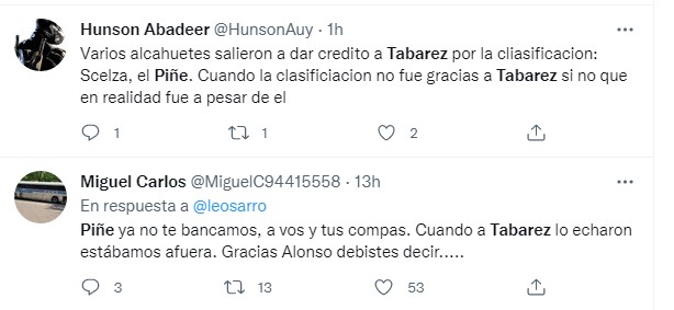 Por eso resultan desmedidos algunos halagos al cesado entrenador, por parte de un grupo de “comunicadores” como Juan Carlos Scelza quien dijo sobre el ex entrenador celeste: “Tabárez tiene mucho que ver con esto” (?). No hizo referencia a los fracasos del técnico que dejaron a Uruguay al borde de la eliminación y Blanca Rodríguez, quien en Twitter escribió: Si digo “Maestro”…, o el desnorteado Jorge Piñeyrúa, que parece que los 16 puntos en 42 posibles, que apenas obtuvo el septuagenario estratega, son una “hazaña” y no un grave desacierto que de no mediar Diego Alonso, hoy Uruguay estaba fuera del mundial si continuaba Tabárez: “Quiero felicitar a Oscar Washington Tabárez que nos llevó por cuarta vez a un Mundial!! Por supuesto a Diego Alonso”, agregó Piñeyrua en un mensaje surrealista y nada cierto.