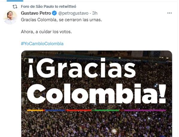 El Foro de Sao Paulo, el cual está en sintonía ideológica con Petro se congratula este domingo con su candidato para la presidencia de Colombia.