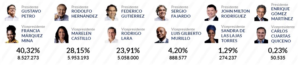 Con el 99,99% de las mesas escrutadas, Petro se queda con el 40,32 por ciento de los sufragios, seguido por Hernández, con 28,15 por ciento.