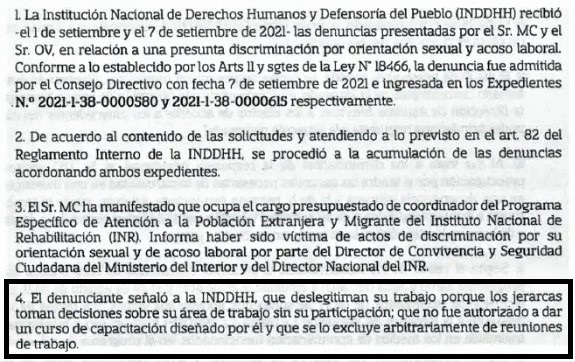 La Institución Nacional de Derechos Humanos y Defensoría del Pueblo (INDDHH) de Uruguay, es un organismo que deja serias dudas sobre su imparcialidad al intervenir en hechos sobre temas de presunto acoso laboral, porque ante denuncias que habría recibido, no actúa con las reservas del caso y expone nombres de personas, sin esperar a recibir las respuestas y/o descargos de los presuntos implicados. Directivos del instituto piden al Ministro del Interior investigue para “aclarar la responsabilidad administrativa de los funcionarios que intervinieron”.